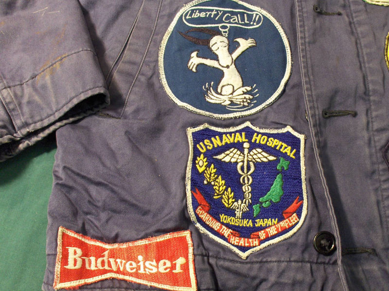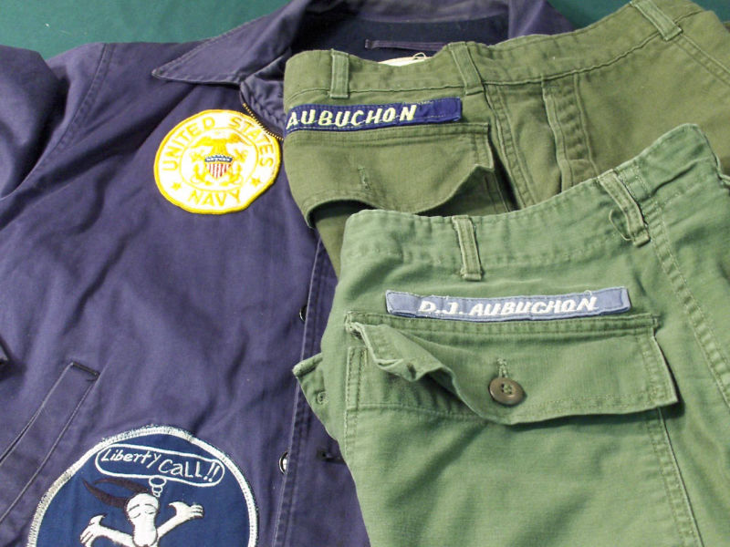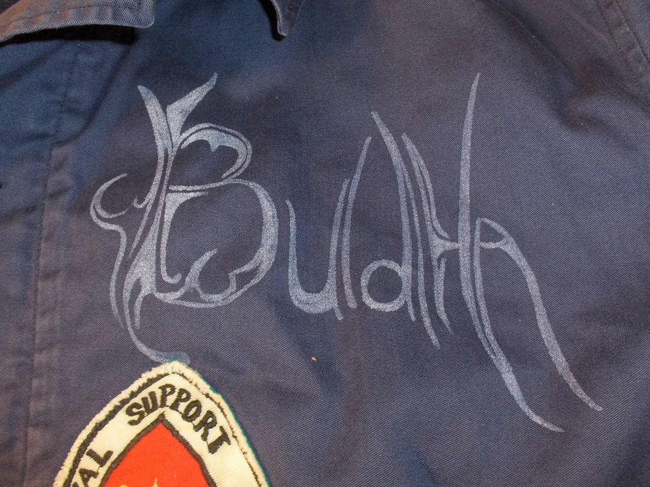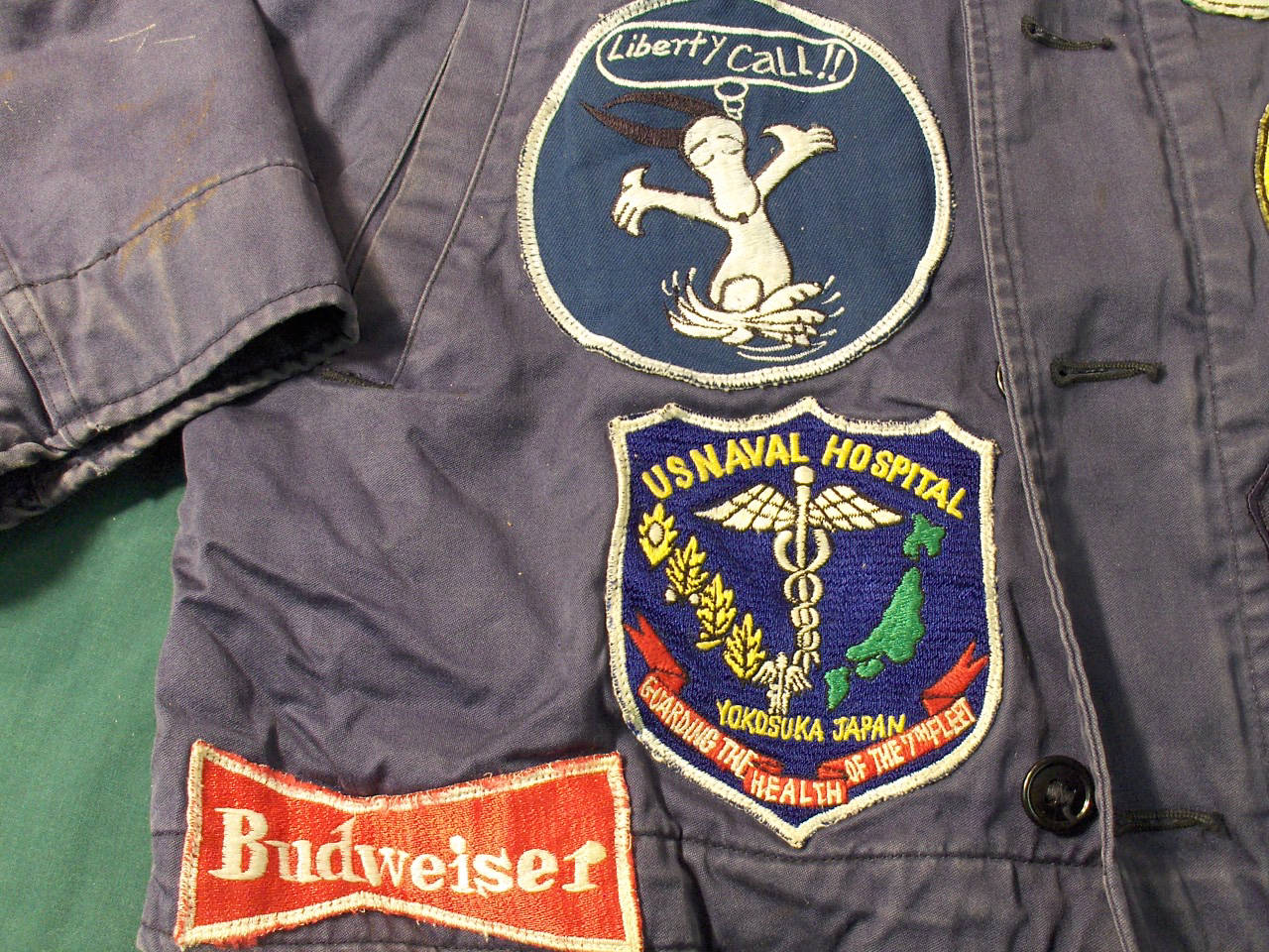 Found in an abandoned house, very cool tour jacket for US Navy vet, a lot of the patches are theater made , nick name Buddha, jacket was found with pants with theater made name tapes DJ Aubuchon.